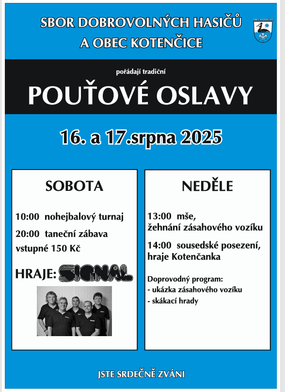 Přijďte se pobavit na tradiční pouťovou zábavu. K tanci i poslechu nám zahraje kapela Signál.